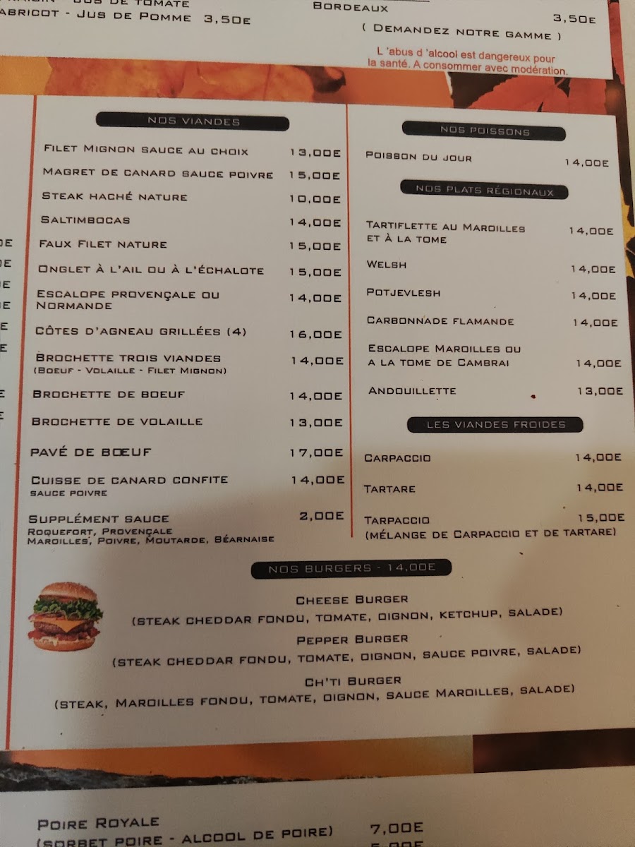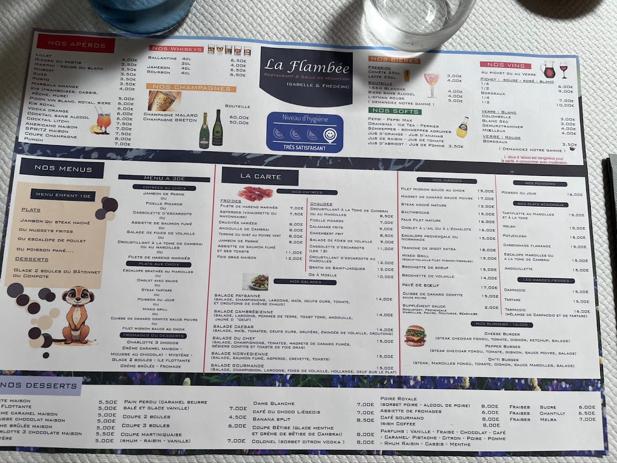 The menu at La Flambee features exquisite, homemade dishes that showcase authentic French cuisine. Signature items like Carbonnade Flamande and Escalope maroilles are crowd favorites, celebrated for their rich flavors and generous portions. For just €30, diners can indulge in a complete meal of starter, main, and dessert, all crafted with care.